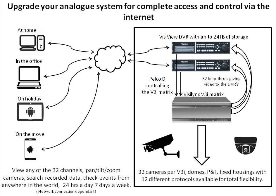 The Visilynx V3i is an extremely versatile matrix switcher, with 32 inputs and 8 outputs as standard contained in a 19" wide by 3U high enclosure. It allows you to connect two identical units together using an expansion cable to form a full 64x16 matrix. Molynx C type (Molynx Coax telemetry) is supported also RS485 protocols: